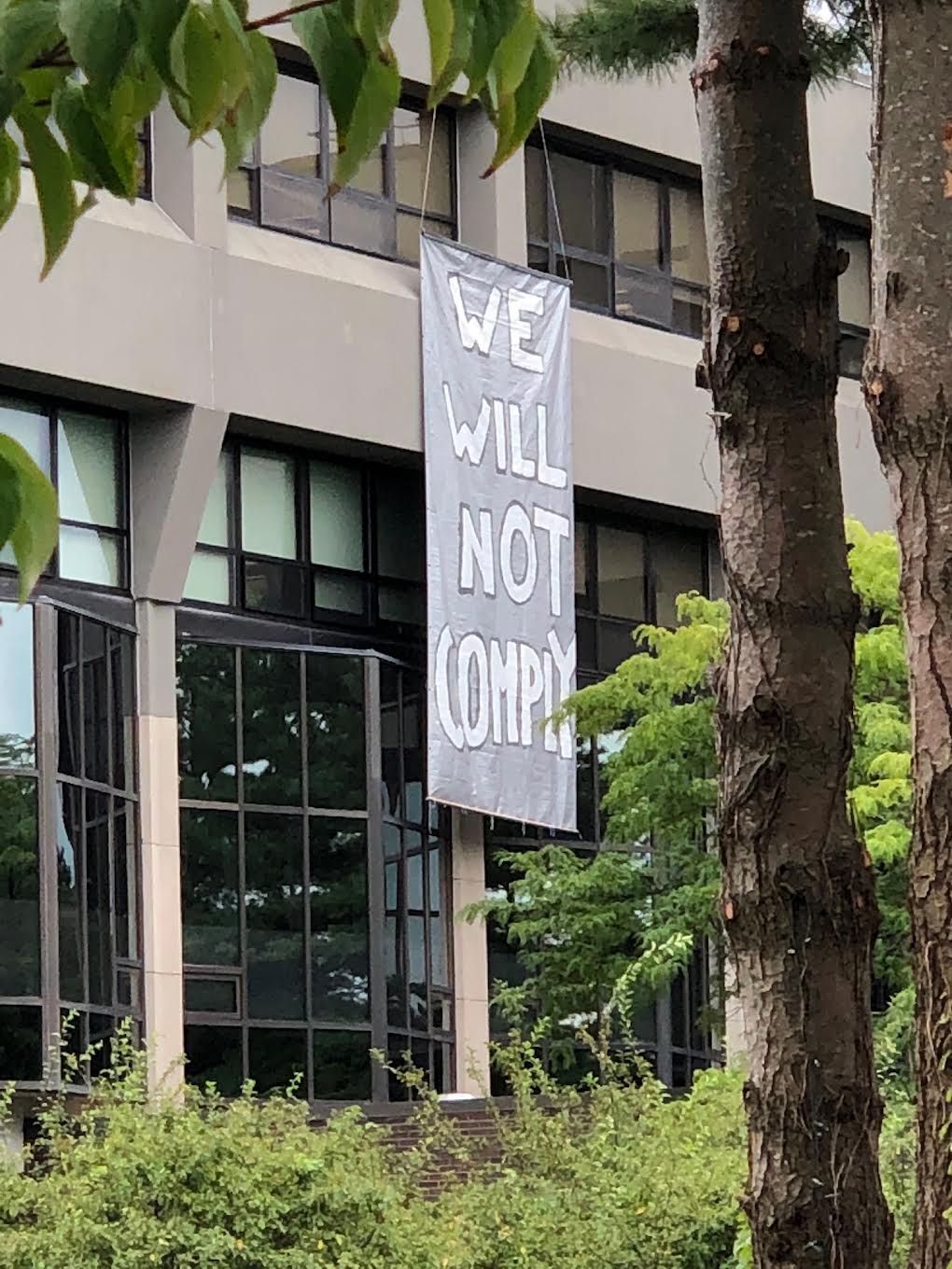 Matland said he came out to the protest over his lunch break, gave a brief speech to the crowd, and spoke to local and national media. Around the time he was doing an interview with Newsmax, someone unfurled a two-story banner from the top of one of the hospital buildings that read, "We Will Not Comply." Hospital leaders blamed Matland.