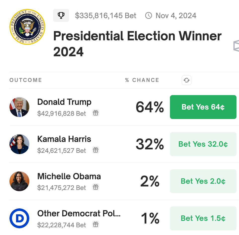 6. Harris odds rises from 30% to 32% as she gets support from majority of pledged delegates |