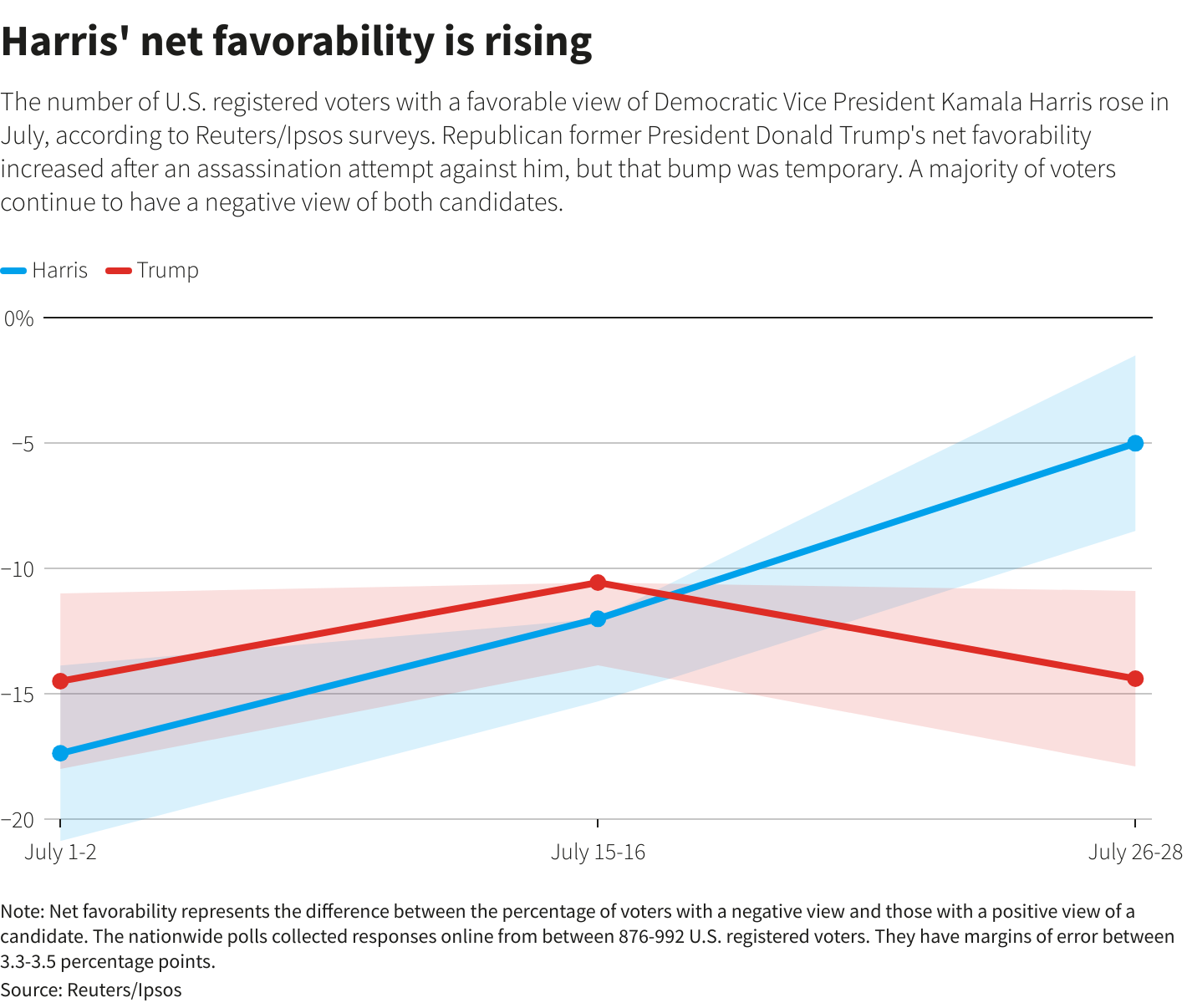 At this stage in the race, just over two weeks from the Democratic National Convention and three months before Election Day, both sides are racing to shape public perceptions of their opponents, particularly for independent or undecided voters not yet wed to either candidate. As my colleague Alexandra Ulmer and I reported last week, Trump has has called Harris "crazy" and "nuts." He has nicknamed her "Laffin' Kamala," mocking her laugh, and "Lyin' Kamala," asserting she tried to hide the effects of President Joe Biden's aging from the public.