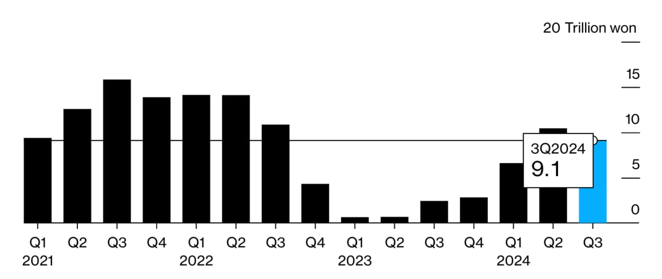 Samsung's preliminary operating profits were 9.1T won ($6.8B) for Q3, less than the expected 11.5T won: |