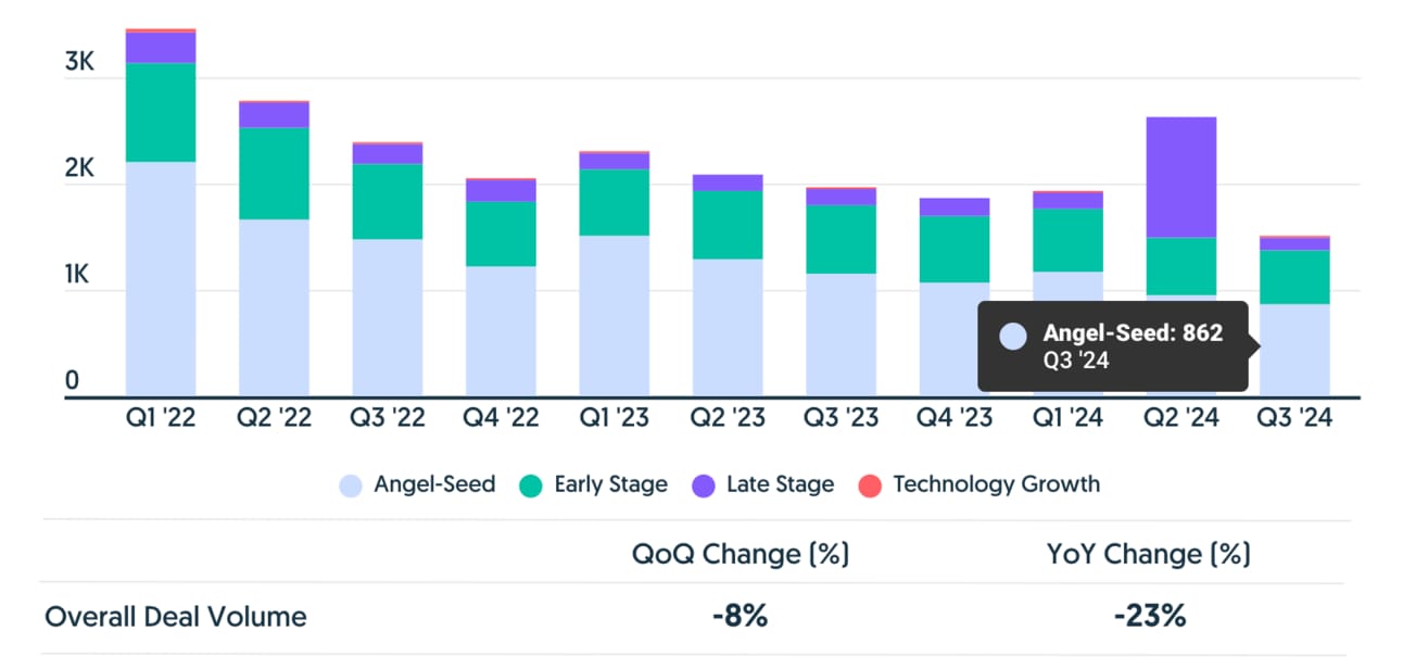 Angel and seed rounds continued to lead in number of deals, but with 23% fewer deals (862), vs. 1,152 a year prior |