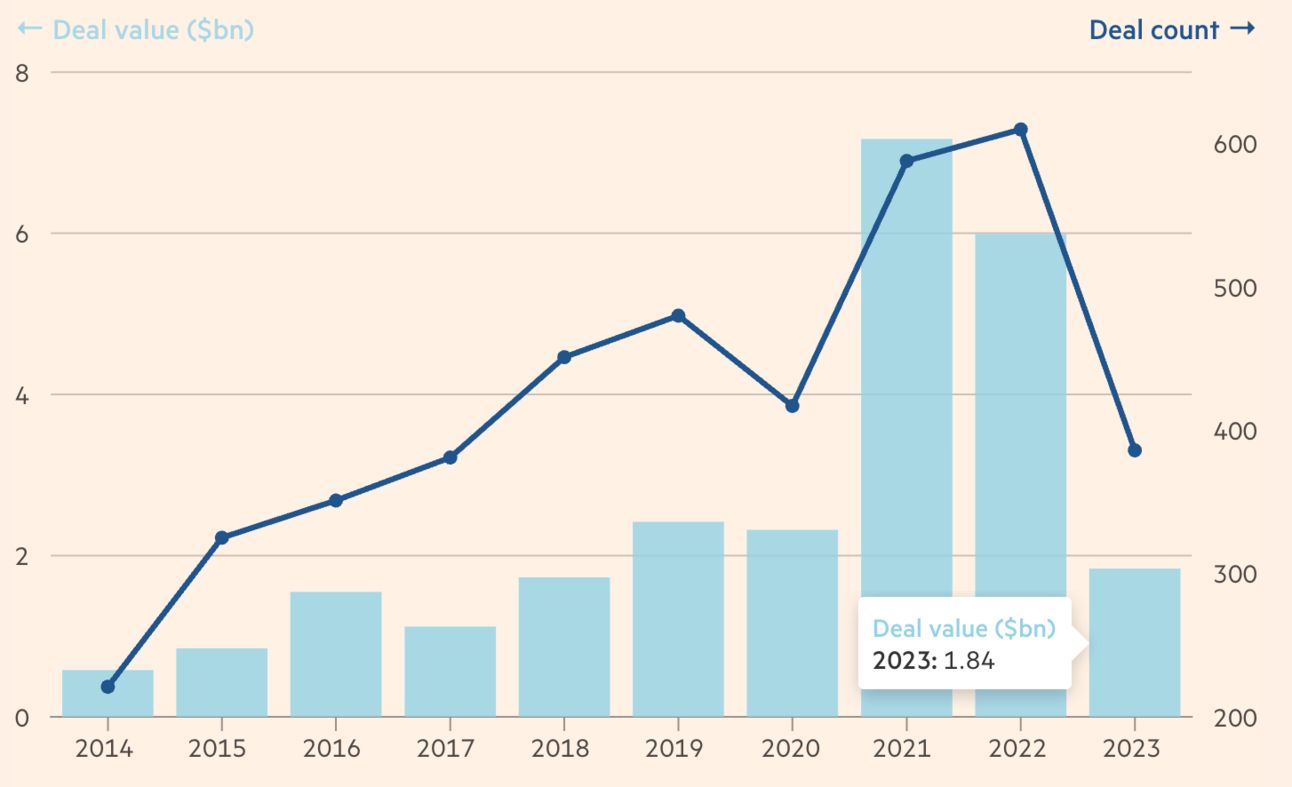 Annual VC funding in the online gig space since 2022 is -2/3rd, after 3x'ing between 2020 and 2021 |