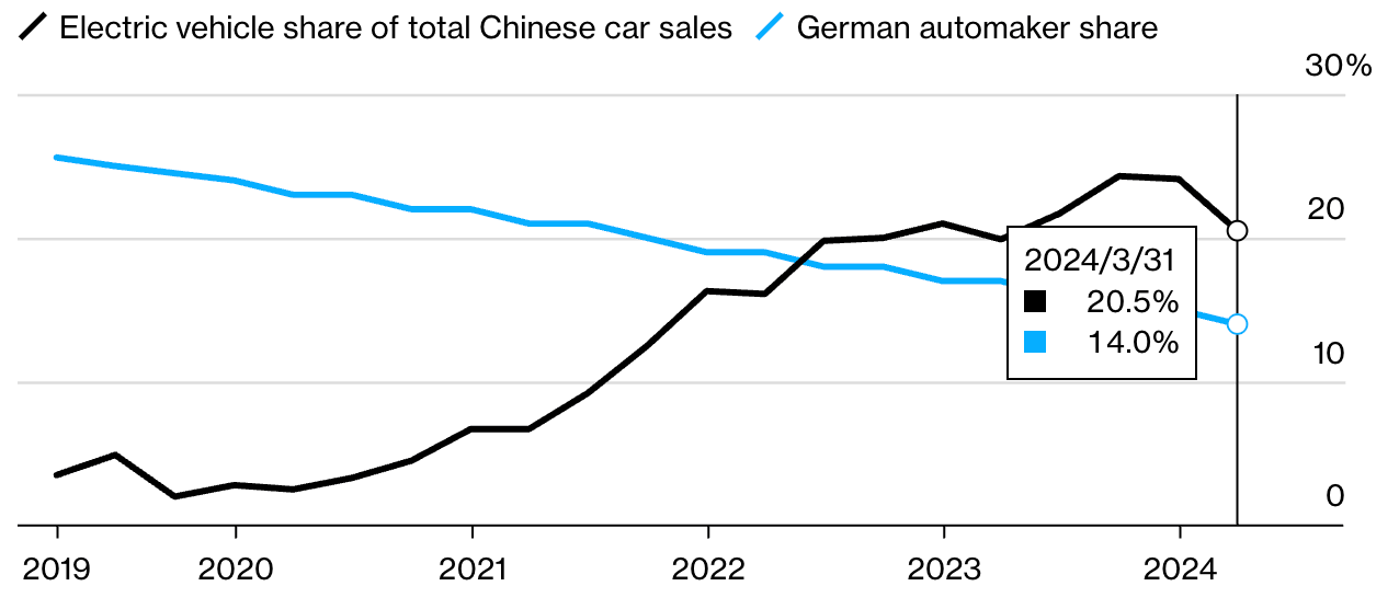 VW, Mercedes, and BMW see a continued decline in their market share in China, as the EV share grows: |