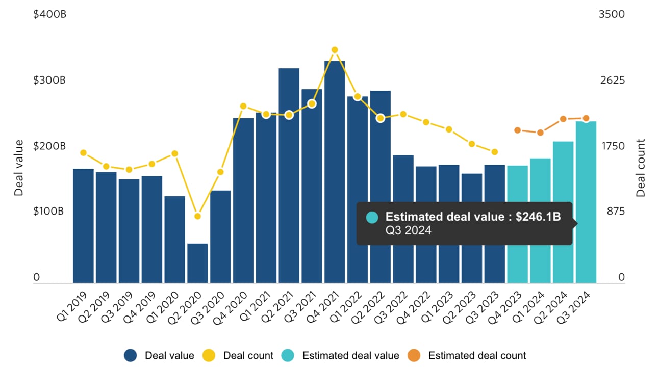 2,198 PE deals worth of $246.1B were closed in Q3, vs. 1,750 of $179.9B a year ago: |