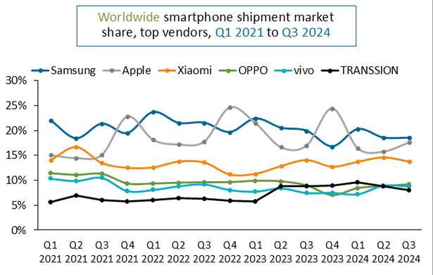Samsung continues to lead the market, with 18% share, vs. 21% in Q3 2023 |