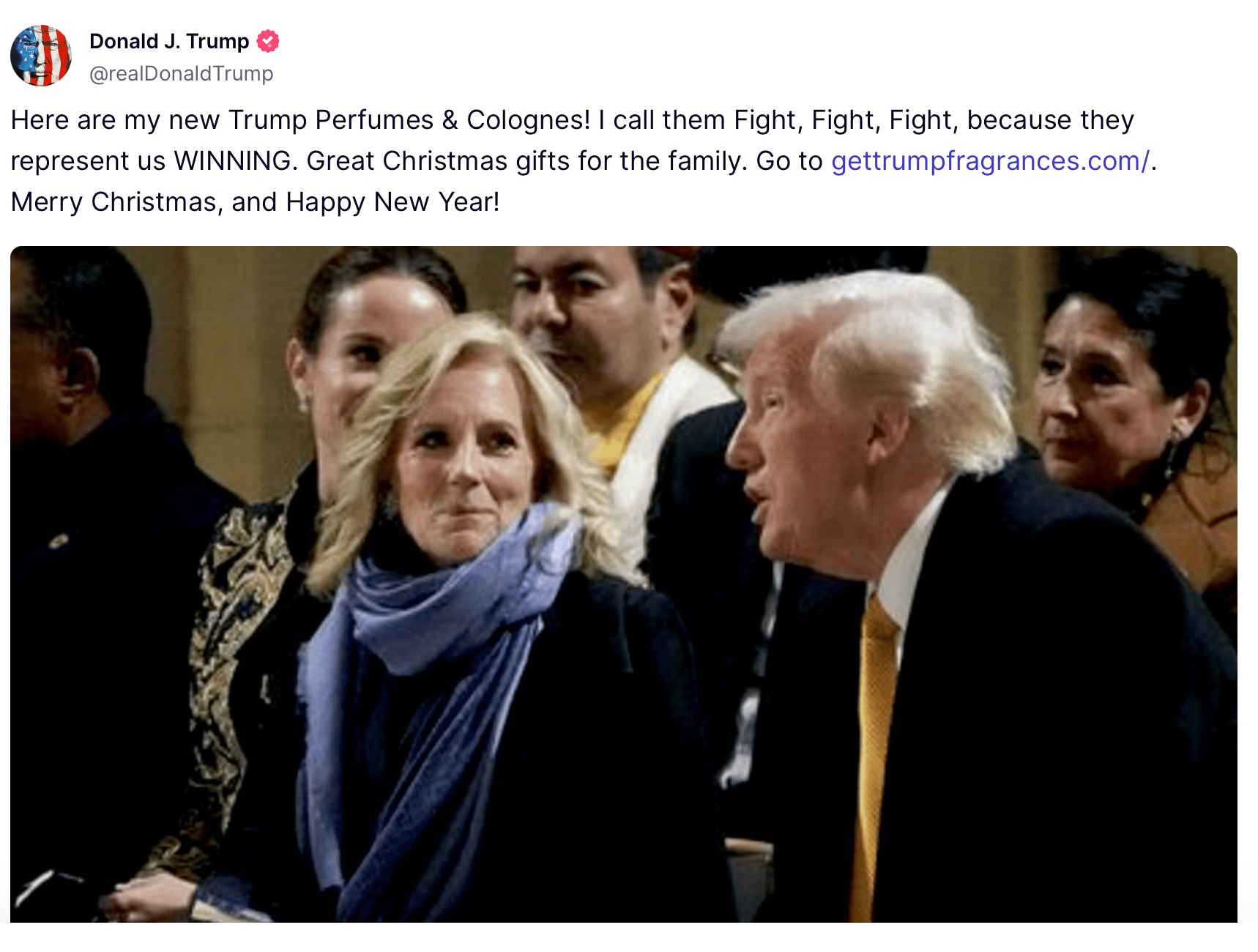 Trump turns photo of beaming first lady Jill Biden into a perfume sales pitch . . . President-elect Donald Trump smelled a business opportunity when the cameras caught first lady Jill Biden smiling at him during the grand reopening of the Notre Dame Cathedral in Paris. Mr. Trump posted a version of the photo on Truth Social with his brand of colognes and perfumes and the tagline: "A fragrance your enemies can't resist!" Washington Times