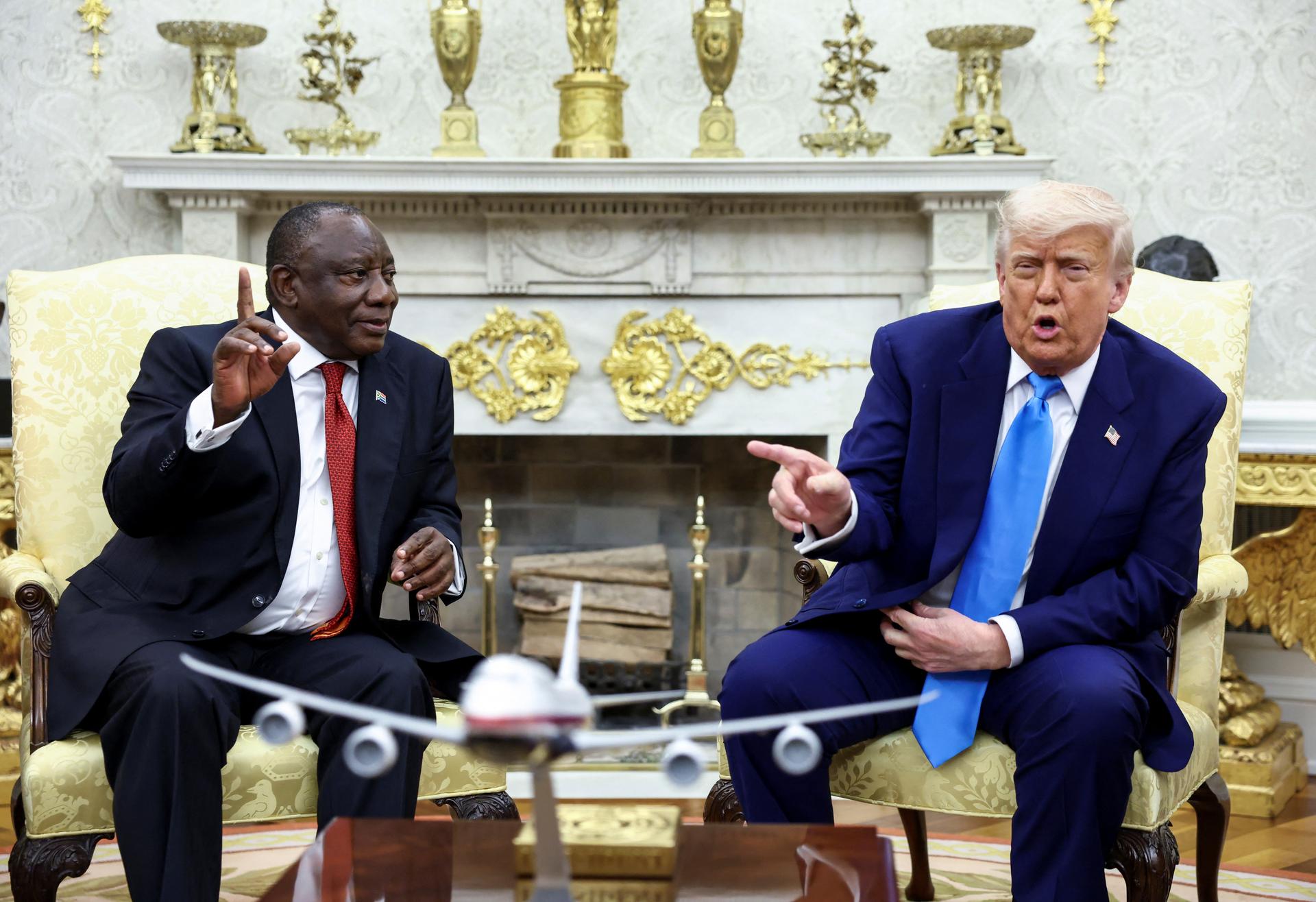 U.S. President Donald Trump meets South African President Cyril Ramaphosa in the Oval Office of the White House in Washington, D.C., U.S., May 21, 2025. REUTERS/Kevin Lamarque |