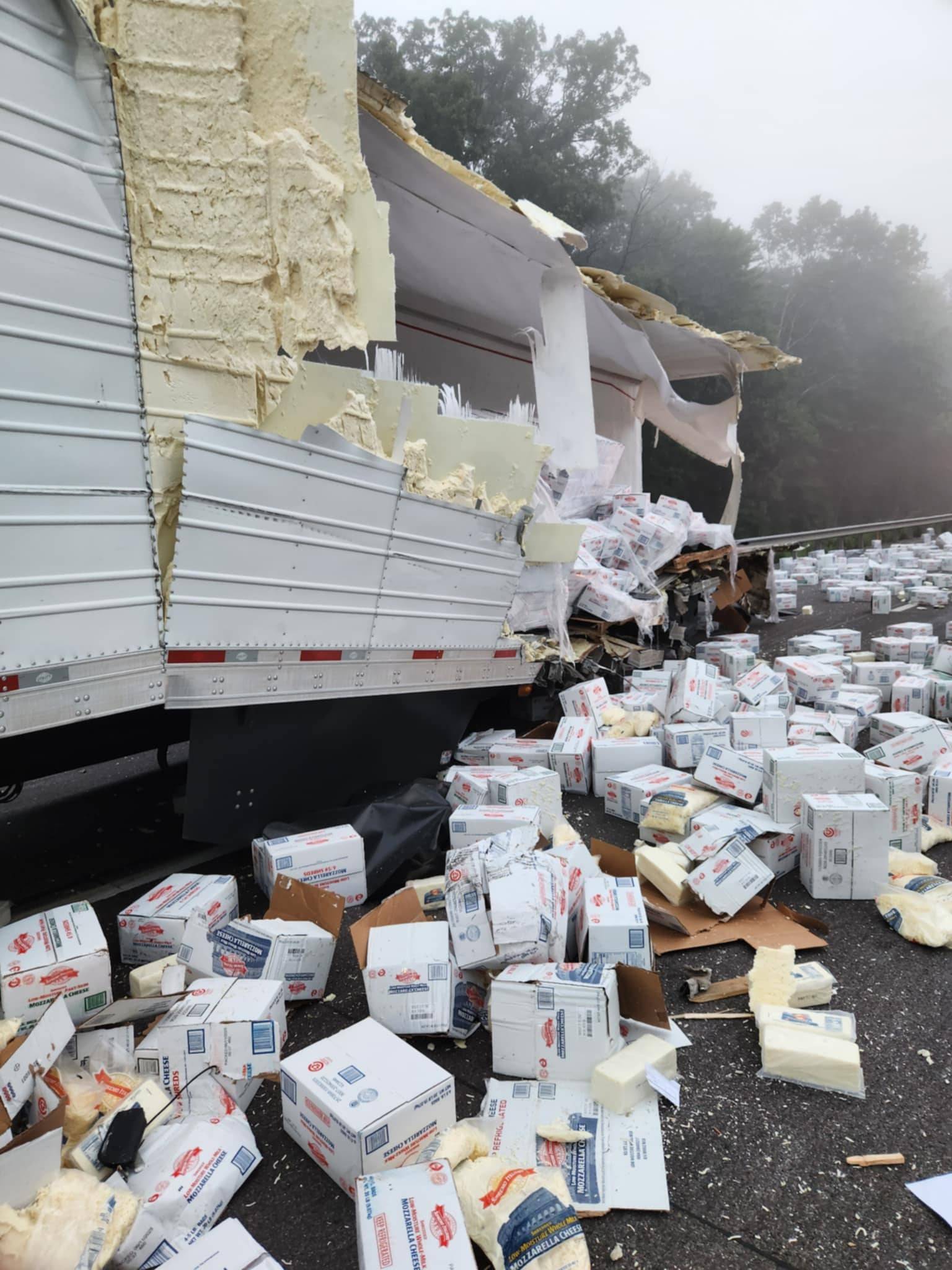Crash covers interstate in boxes of mozzarella cheese . . . Firefighters were called to a stretch of interstate in Pennsylvania after a crash involving three tractor-trailers resulted in mozzarella cheese being spilled across a 200-yard area. The Snow Shoe Fire Company said on social media that the Pennsylvania State Police notified Clearfield County that a crash had occurred at mile marker 145 on eastbound Interstate 80, leaving a debris field covering an area of about 200 yards. UPI