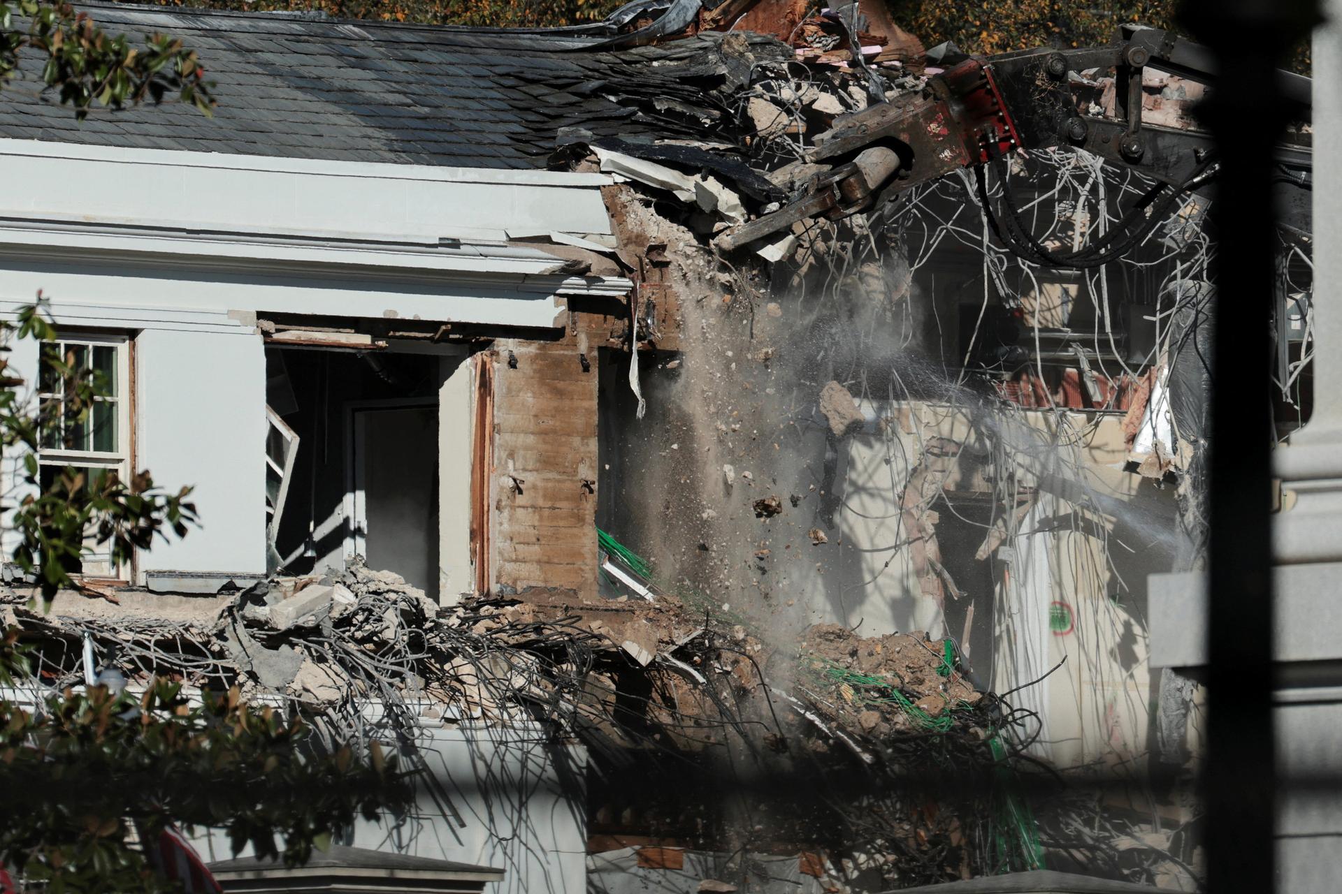 A demolition crew takes apart the facade of the East Wing of the White House, where U.S. President Donald Trump's proposed ballroom is being built, in Washington, D.C., U.S., October 21, 2025. REUTERS/Jonathan Ernst |