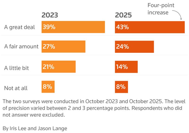 An increasing share say they are worried a great deal, according to a new Reuters/Ipsos survey |