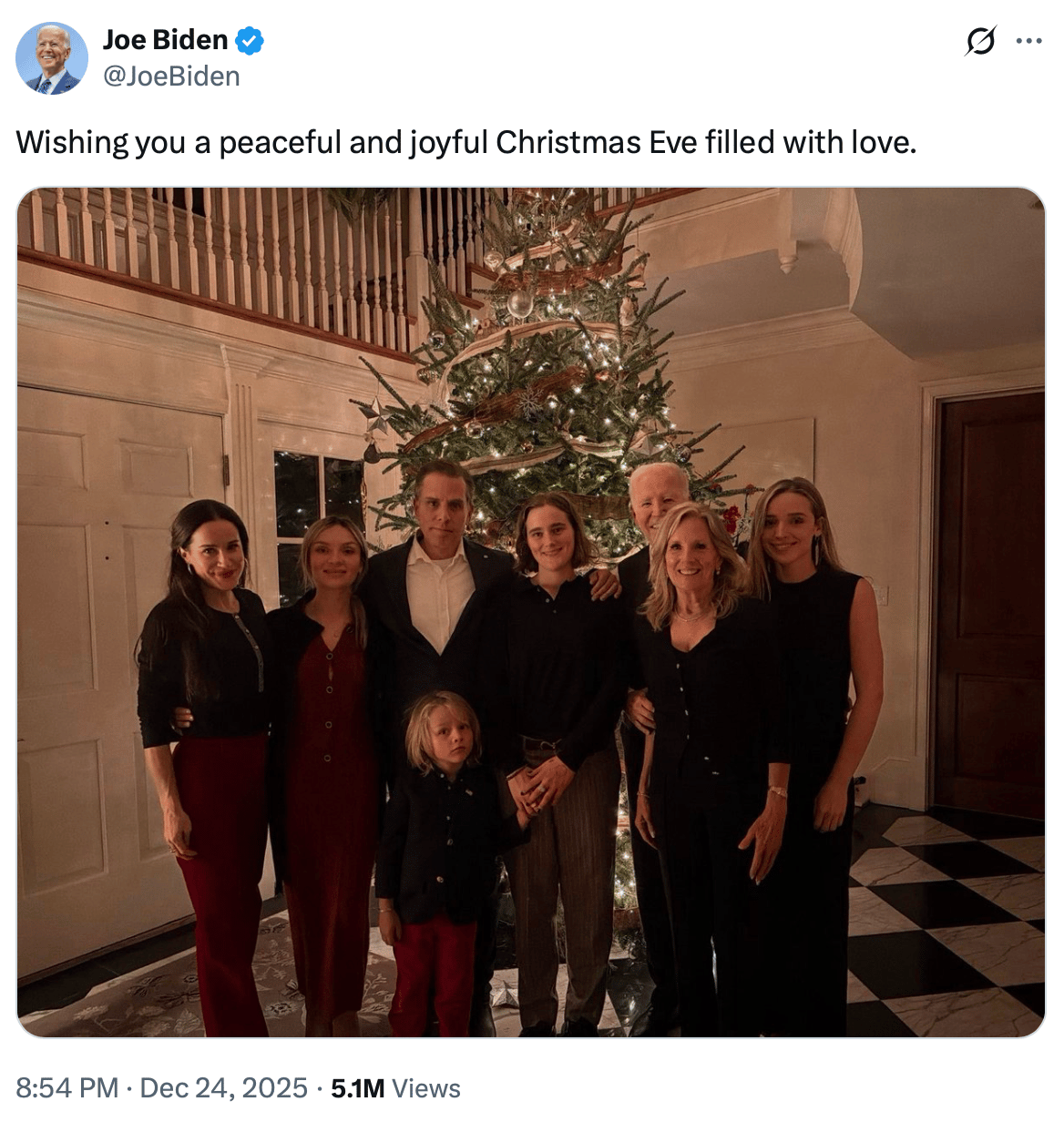 Biden nearly invisible in own Christmas family photo as Hunter takes center stage . . . Joe Biden drew online snark after sharing a Christmas Eve family photo that left him half-hidden while Hunter Bidenstood front and center. Jill Biden partially blocked Biden's face as the rest of the family appeared fully framed. Critics mocked the staging as symbolic—another holiday moment where the former president seemed sidelined in his own spotlight. Fox News