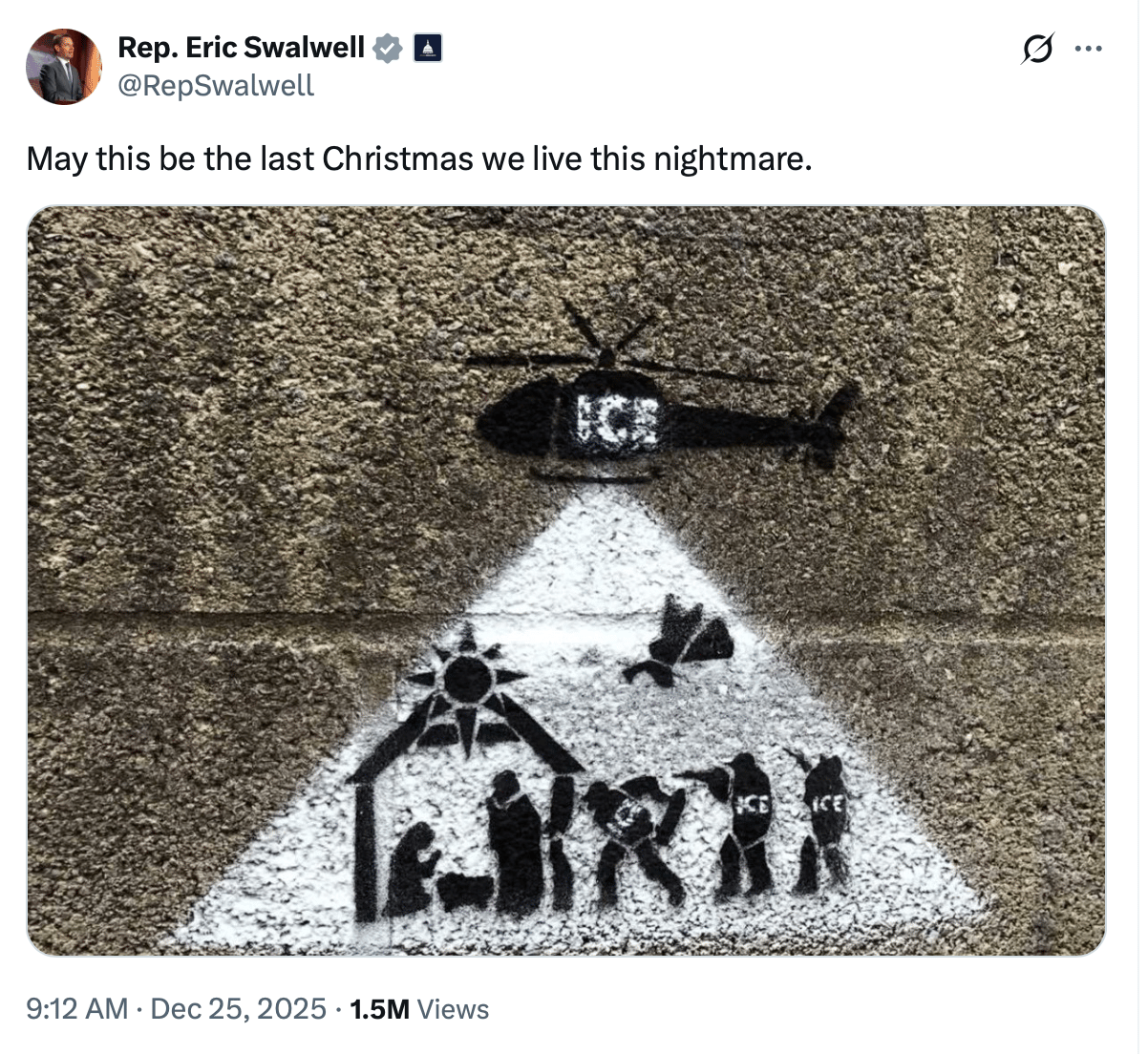 Rep. Eric Swalwell Likens Jesus, Mary, and Joseph to Illegal Migrants on Christmas . . . Eric Swalwell ignited Christmas outrage after posting a nativity scene depicting Immigration and Customs Enforcement raiding Mary, Joseph, and the infant Jesus, casting them as illegal migrants. Critics blasted the stunt as cynical and inaccurate, noting Scripture says the family traveled lawfully for a Roman census ordered by Caesar Augustus. The episode underscored how immigration politics now spill even into sacred imagery. Breitbart