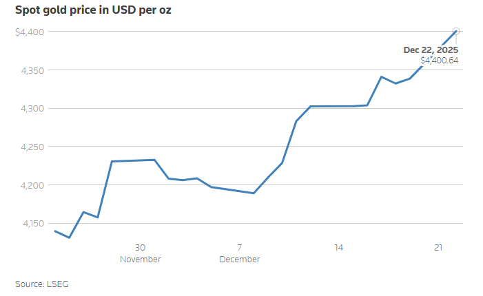 - Gold jumped past the $4,400-per-ounce level for the first time on Monday, riding on growing expectations of further US rate cuts and strong safe-haven demand, with silver also joining the rally to hit an all-time high.