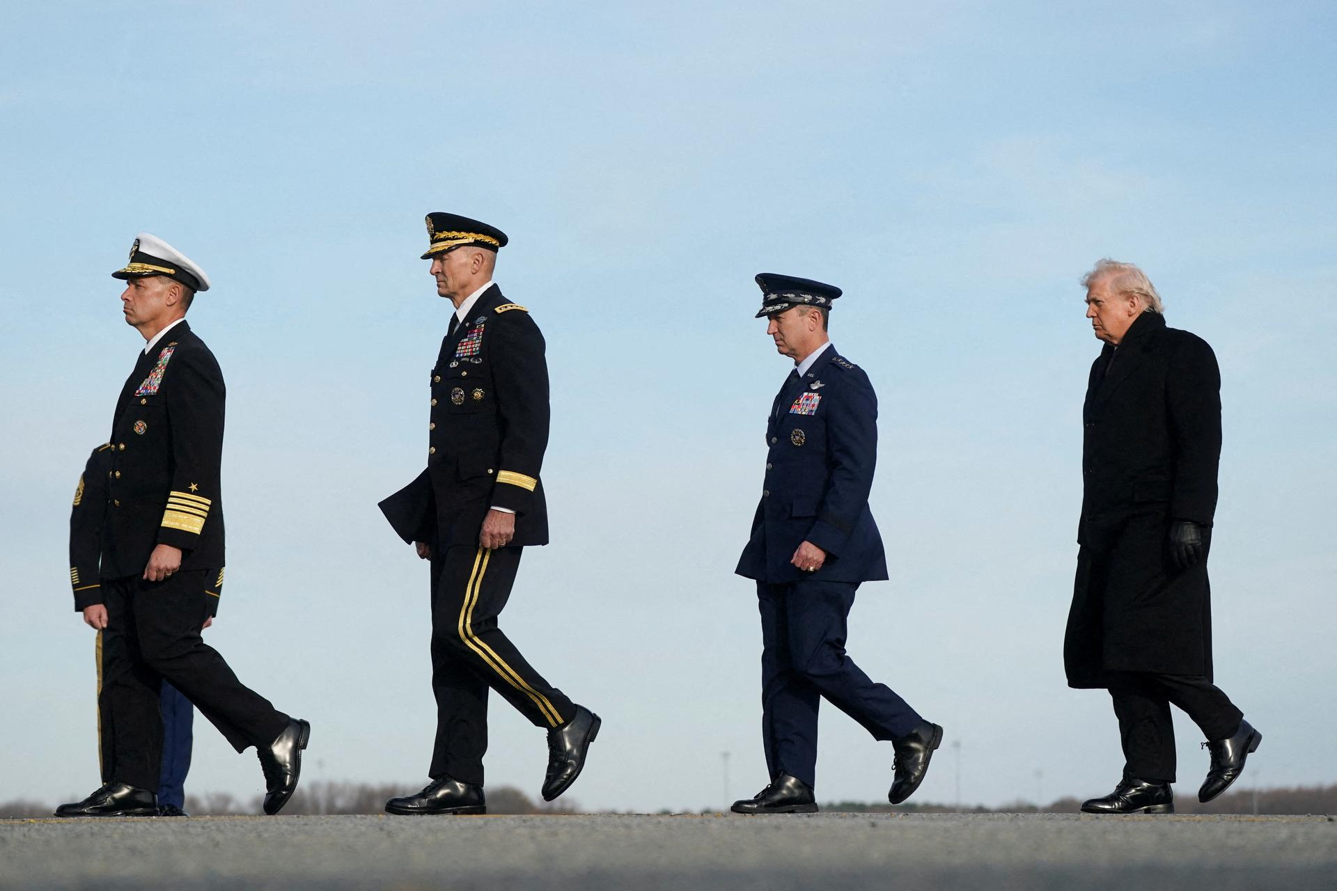 U.S. President Donald Trump participates in a dignified transfer of the remains of two Iowa National Guard members killed in Syria, Sgt. Edgar Torres Tovar and Sgt. William Howard, and Ayad Mansoor Sakat, of Macomb, Michigan, who was working as an interpreter in Syria, at Dover Air Force Base in Dover, Delaware, U.S., December, 17, 2025. REUTERS/Nathan Howard |