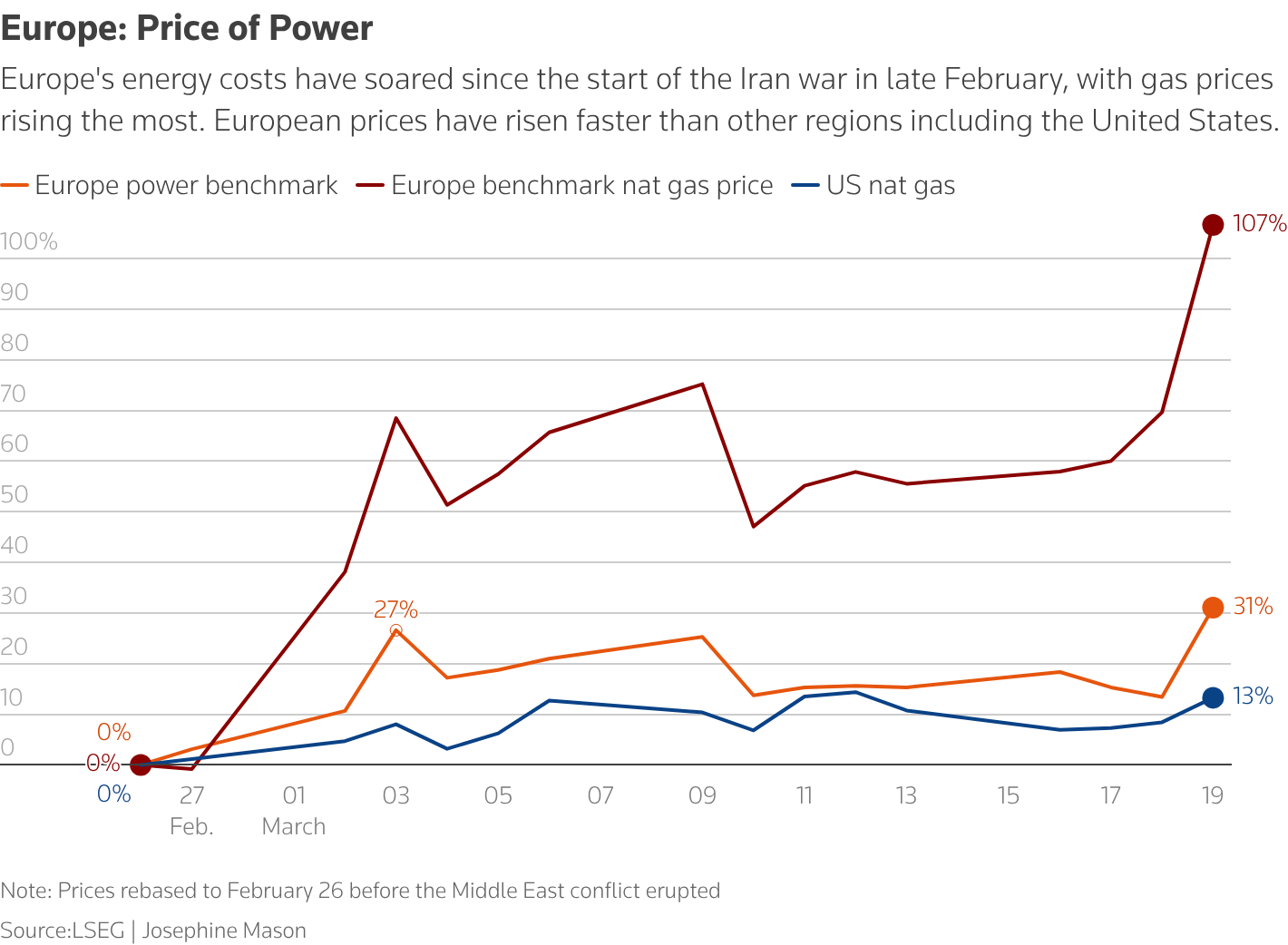 - The fallout from war in the Gulf is hitting harder in Europe where energy prices are already higher than other regions from Russia's invasion of Ukraine and then punishing US tariffs. Germany's economy alone could face a 40 billion euro hit over two years if oil stays at $100 a barrel, according to the IW German Economic Institute.